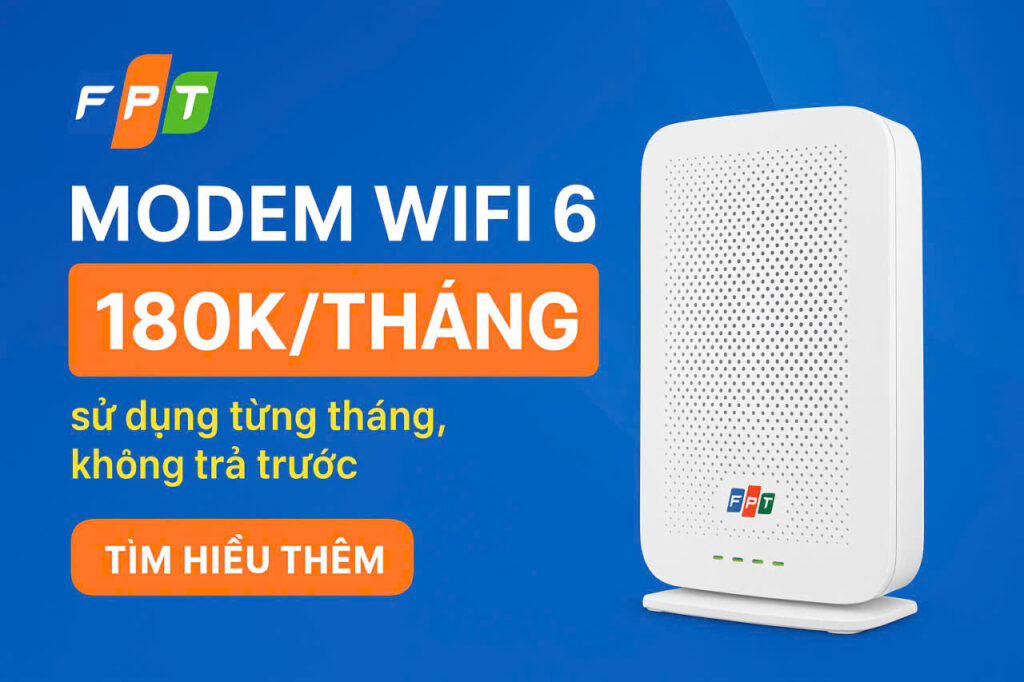 Trang bị Modem WiFi 6 băng tần kép miễn phí cho khách hàng mới – công suất mạnh, phủ sóng tốt trong nhà.